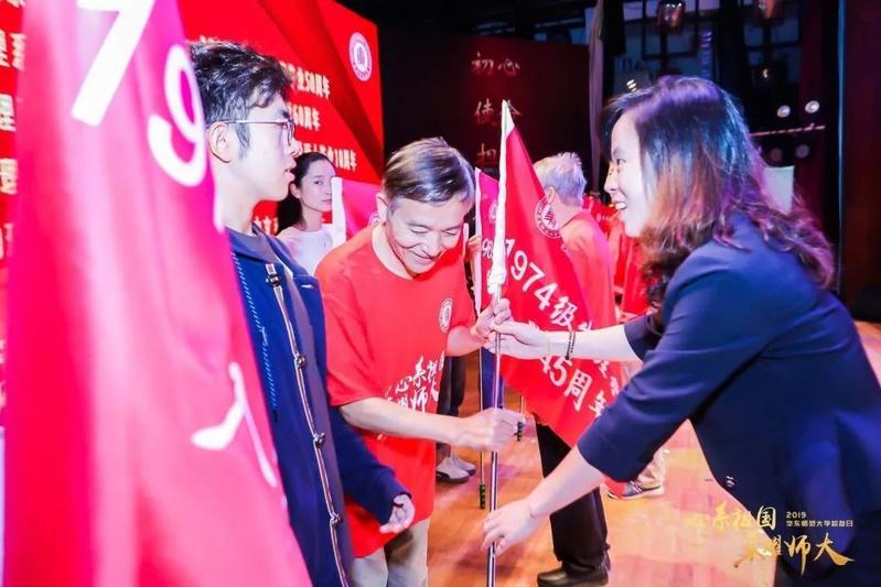 上午九点半,学校校友日启动仪式在思羣堂举行,副校长孙真荣,校长助理、教育发展基金会秘书长斯阳,校友会秘书长邢和祥,各学院领导等参加仪式。副校长孙真荣在致辞中向校友们致以最热烈的欢迎,期盼并鼓励校友们为学校发展建言献策,为师生成长提供支持,共同谱写师大的新篇章。在授旗仪式环节,学院党委副书记蒋旭为物理与电子科学学院7个返校班级代表授旗。