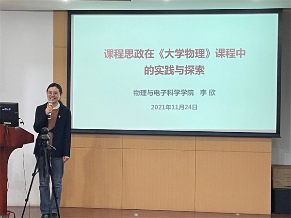 李欣以“课程思政在《大学物理》课程中的实践与探索”为题作主题报告,就《大学物理》的课程形式、课程内容、学生互动、课后学习和课程思政评价等方面做了分享。她谈到,通过增加课堂互动、改善授课方式,设计趣味实验、增加前沿内容,潜移默化地将思政教育融入课程中,从而激发学生的求知欲,提高课程效率。