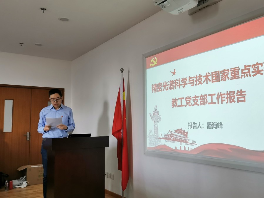 精密光谱科学与技术国家重点实验室教工党支部书记潘海峰首先代表本届党支部委员会作工作报告。报告分为五部分:一是加强学习,不断提升党员同志政治站位和政治素养;二是注重效能,开展高质量的主题党日和组织生活;三是精准定位,支部服务实验室主体工作;四是严格要求,上级领导关心指导支部建设;五是找差距、抓落实,严肃查摆问题开展批评与自我批评。报告对三年来实验室教工党支部在党的建设以及推动实验室中心工作等方面做了全面的回顾和总结,在呈现成绩的同时也指出了不足,并对今后的发展提出了希望。