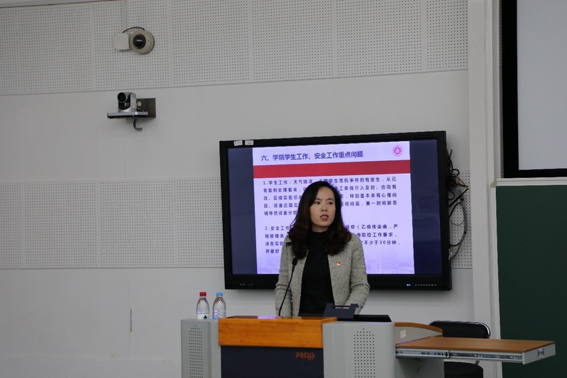 学院党委副书记蒋旭通报了学生双创教育进展,她谈到,在学院师生的共同努力下,目前学院在学校双创实验室/项目培育、学生创业项目培育等方面取得了一定的成效,后续期待学院教师在双创项目跟踪指导、双创课程申报优化等方面投入更多时间,取得更大的成绩。蒋旭同时强调了近期学生工作注意事项和实验室安全管理要求。