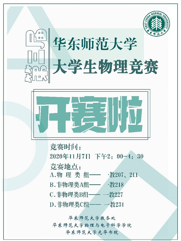 为展现物理学科魅力,培养学生创新精神,由教务处主办,物理与电子科学学院、光华书院承办的第三届华东师范大学大学生物理竞赛于11月7日在我校顺利举行。