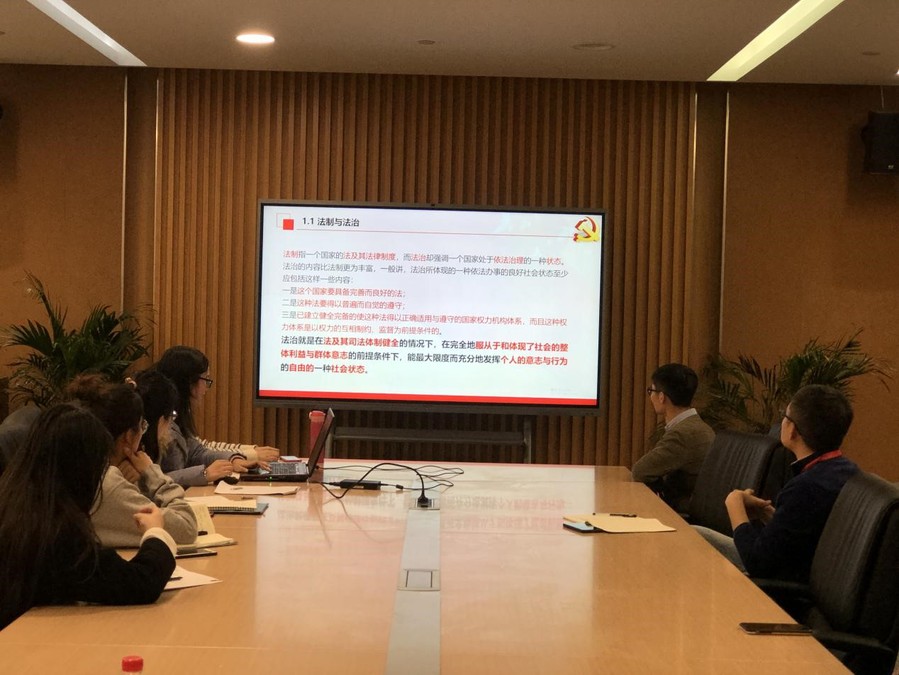 宣传委员梁家毓就坚持和完善中国特色社会主义法治体系,提高依法治国、依法执政能力一条进行了解读。她首先就法律体系等内容介绍了法律的基本知识,在此基础上通过列举生活实例,和与会党员共同探讨其中的法律知识,给大家上了一节生动的法律科普课。最后,她谈到建设中国特色社会主义法治体系、建设社会主义法治国家是坚持和发展中国特色社会主义的内在要求,针对法治的制度建设、推动法治中国建设行稳致远。