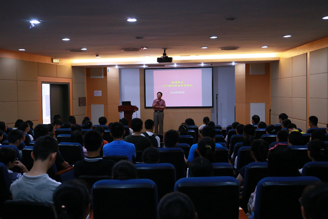 下午13:00点,开学典礼准时开始,物理学系主任黄国翔老师首先致辞欢迎全体新同学,他细致地介绍了物理学系的历史沿革、学科发展概况,并勉 励新同学在物理学系取得新的成就,不管是在学习成绩,还是在做人品格及办事能力方面都能有所提升。副系主任王向晖老师则为大家明确解读大学本科的培养计 划,物理学系为大家提供了一流的师资力量和教学设施,系统的科研训练,和各种锻炼提升的机会。那么,物理学系究竟能给大家带来什么?接下来,物理学系教师 代表朱广天副教授则用幽默风趣的讲话从物理学系学习生活的方方面面为大家介绍了大学四年的生活。而后,物理学系党委书记马学鸣老师用对“爱在师大”的别样 解读,表达了对新同学们在物理学系这个有爱的大家庭里能全面发展的期待。物理学系学生会主席2013级物理学专业学生欧阳天成和2015级新生张文初分别 做为老生代表和新生代表讲话。