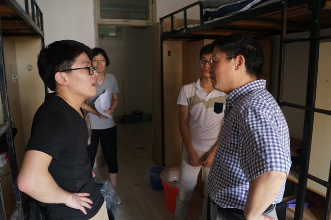 晚6:30,物理学系副主任王向晖老师和新生辅导员聂树伟老师依次前往研究生公寓各宿舍关心慰问新生,就生活、学术等问题和同学们展开了热 切的交流。在交流中,老师们特别询问了同学们饮食是否习惯,蚊帐、床铺是否安置妥当等。老师对同学们生活细节的关怀让新生倍感温暖,大家很快就不再拘谨, 和老师们展开热烈的交流,出于对即将到来科研生活的期待,同学们按捺不住内心的激动和好奇,急切地向老师询问和学术有关的诸多问题:我现在应该要看什么 书?什么时候可以进实验室……同学们高涨的情绪让老师们也受到了感染,并给同学们提出了中肯的建议。