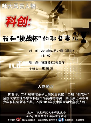 2013年3月27日下午13点,“师大风云人物”系列讲座——我和“挑战杯”的那些事,在物理楼226报告厅举行。校研究生院副院长兼研工部 部长刘敏老师、校研会主席唐婧琦莅临现场指导。物理系纳光电集成与先进装备教育部工程研究中心主任、终身教授、熊智淳同学的导师——孙卓老师作为点评嘉宾 出席了讲座,物理系党委副书记李燕老师主持了讲座。 熊智淳同学是物理系2011级硕士研究生,曾获十二届“挑战杯”全国大学生课外学术科技作品竞赛特等奖、第五届上海市青少年科技创新市长奖、2011年度 中国大学生年度人物入围奖、华东师范大学校长奖学金等奖项。