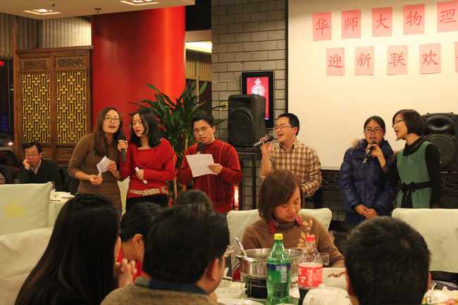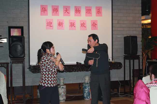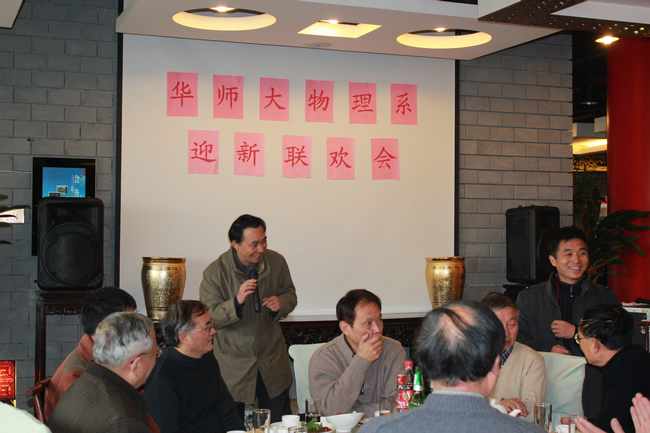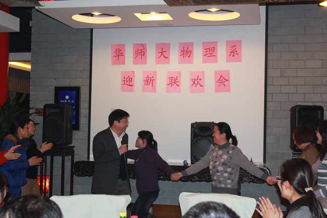 2013年1月9日晚上,物理系教师迎新年联欢会在上海黔香阁酒店举行,系全体在职教职工参加了联欢会和晚宴,多位校领导也莅临联欢会和晚宴现场。系主任黄国翔向大 家祝贺新年快乐,感谢一年来全系教职工的辛勤工作,感谢学校对物理系工作的支持,希望新的一年物理系取得更大的成绩。曾在物理系担任过系党委书记的校党委 副书记杨昌利说很高兴回到物理系参加联欢会,祝物理系的发展蒸蒸日上。校长陈群和副校长朱自强与物理系领导和老师们畅谈物理系的发展。6位今年新进教师合 唱的动感歌曲展示了青春的活力,魔术表演吸引了大家聚精会神的关注,陈群校长上台高歌一曲,晚会的气氛达到了高潮。