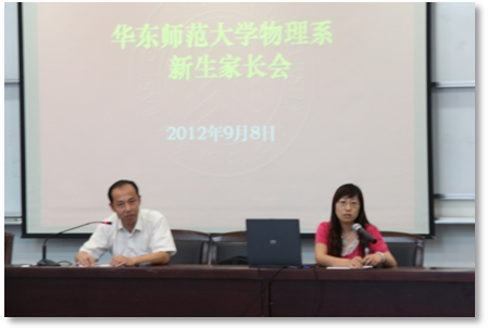 这次本科新生家长会系里进行了全面的策划,希望能够让新生家长对于华东师范大学物理系有一个全面并且直观的了解。会议由物理系党委副书记李燕老师主持,参与本次会议的老师还有2012级辅导员温旭老师。会前首先向与会家长播放了一段物理系的介绍视频,从各方面进行了一个全面生动的反映。
