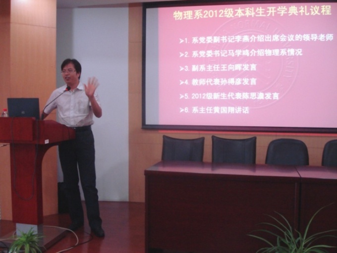 为欢迎新生的到来,物理系于9月10日下午在物理楼报告厅举办了2012级本科生开学典礼。物理系党委书记马学鸣老师,系主任黄国翔老师,副系主任王向晖老师,教师代表凝聚态物理研究所所长孙得彦老师,2012级辅导员温旭老师出席了本次开学典礼,系党委副书记李燕老师主持。