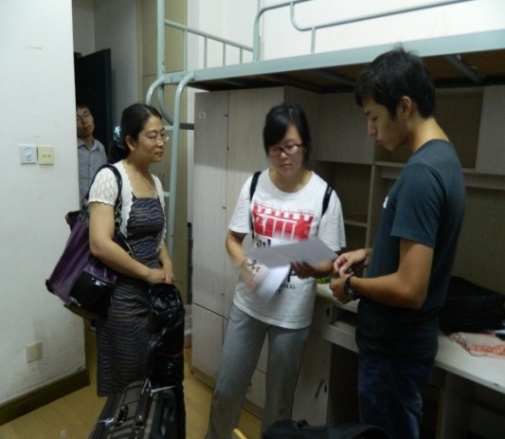 晚上18:00,物理系系主任黄国翔老师和辅导员黄燕萍老师,到达中北校区 中江路学生公寓,逐个探望了新报到的同学,了解学生之前的生活学习情况,鼓励学生从新的起点好好努力,圆满完成研究生几年的学习任务。并一再强调,不管有 生活还是学习的困难,都有物理系这个大集体作为他们最最坚强的后盾。学生都表示非常感动和深受鼓舞!