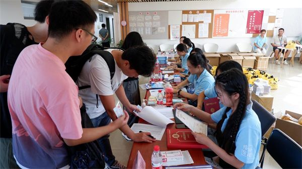 早晨7:30,42名迎新志愿及部分新生学导准时守候在物理楼、大学生活动中心、校门口等点位,协助新生办理报到手续。学院为2023级新生准备了“悟理蓝”院服和“追光”手账本,培养新生归属感和荣誉感,帮助他们尽快融入学院大家庭。