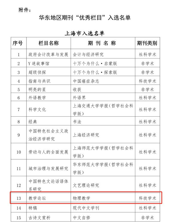 12月30日,由上海市期刊协会联盟组织开展的华东地区期刊“优秀栏目”评选结果揭晓。上海市共有77个栏目入选, 其中,《物理教学》杂志的“教学论坛”栏目榜上有名。