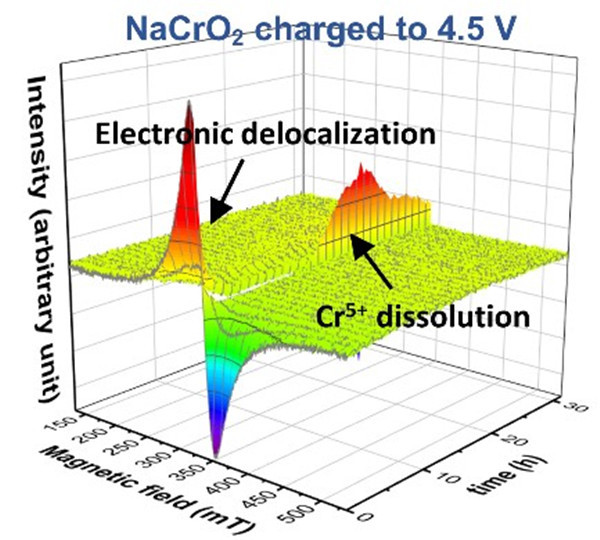 NaCrO因其低成本、高安全性和高功率的特点,成为钠离子电池正极的备选材料之一。在投入实际应用前,有必要进一步理解其在循环过程中的电子结构和相变特性。本研究中,采用原位EPR对NaCrO2在2.2-3.6V和2.2-4.5V电压条件之间循环切换时电子结构的演变进行监测。研究发现,在充电初期NaCrO2脱钠以后产生了电子离域效应,这或许是其具备卓越倍率性能的原因(图1)。