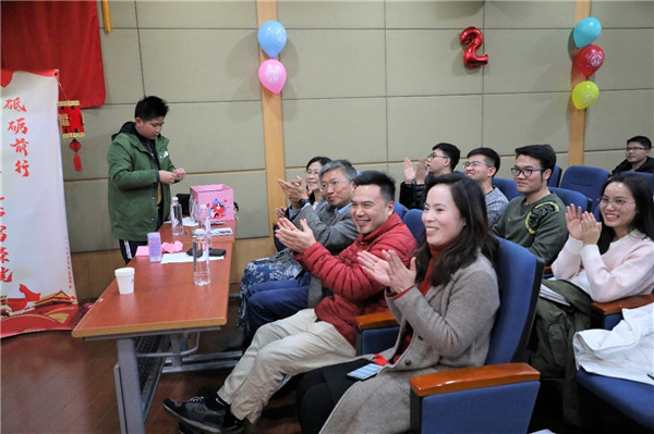 伴随着优美的旋律,参加联欢的师生自选曲目,纷纷上台,或单唱或对唱,博得阵阵喝彩,中间还穿插了“轨道运球”等游戏环节,留校学生7人一组,用两根绳子制造轨道,将乒乓球在3个轨道中运输。联欢会上,学院不仅为每位留校同学准备了一份新春大礼包,还在现场分别抽出了一二三等奖和特等奖,为同学们带来了幸运和快乐。