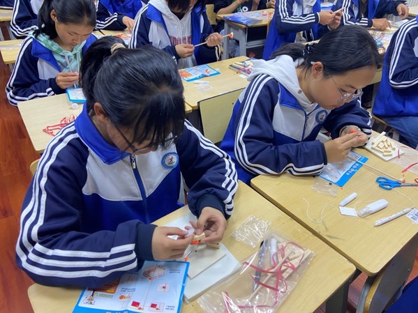 在实验环节,刘文慧向大家细致讲解了实验材料、组装要求及实验装置的各种细节。随后,金所中学的同学们自己动手完成了实验装置。科普小实验很好地将理论知识与动手实践结合起来,引导同学们积极探索、主动创新,激发科学兴趣。