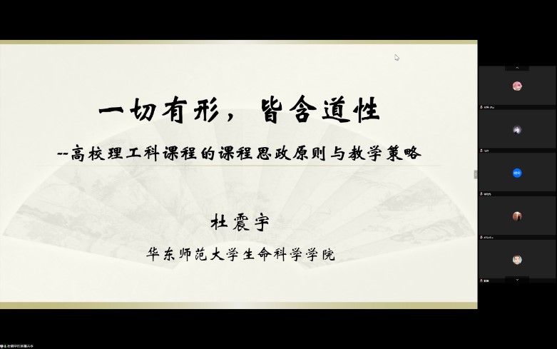 为进一步“用好课堂教学这个主渠道”,发挥理工科课程的思想政治教育功能,进而在全院形成三全育人的“大思政”格局,4月28日晚,由物理与电子科学学院党委主办,物理实验教学中心教工党支部、物理系教工党支部、材料系教工党支部和电子系教工党支部联合承办的课程思政专题学习研讨会成功举办。生命科学学院杜震宇教授在线作《理工科课程思政教学原则与教学策略》专题报告,学院党委书记李恺,副院长周先荣、胡炳文,副书记蒋旭等近百位教师与会学习研讨。会议由物理实验教学中心教工党支部书记尹亚玲主持。