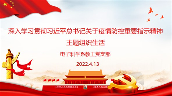 4月13日下午,电子科学系教工党支部开展主题党日活动,在线学习习近平总书记关于疫情防控重要指示精神,会议由支部书记黄荣主持。