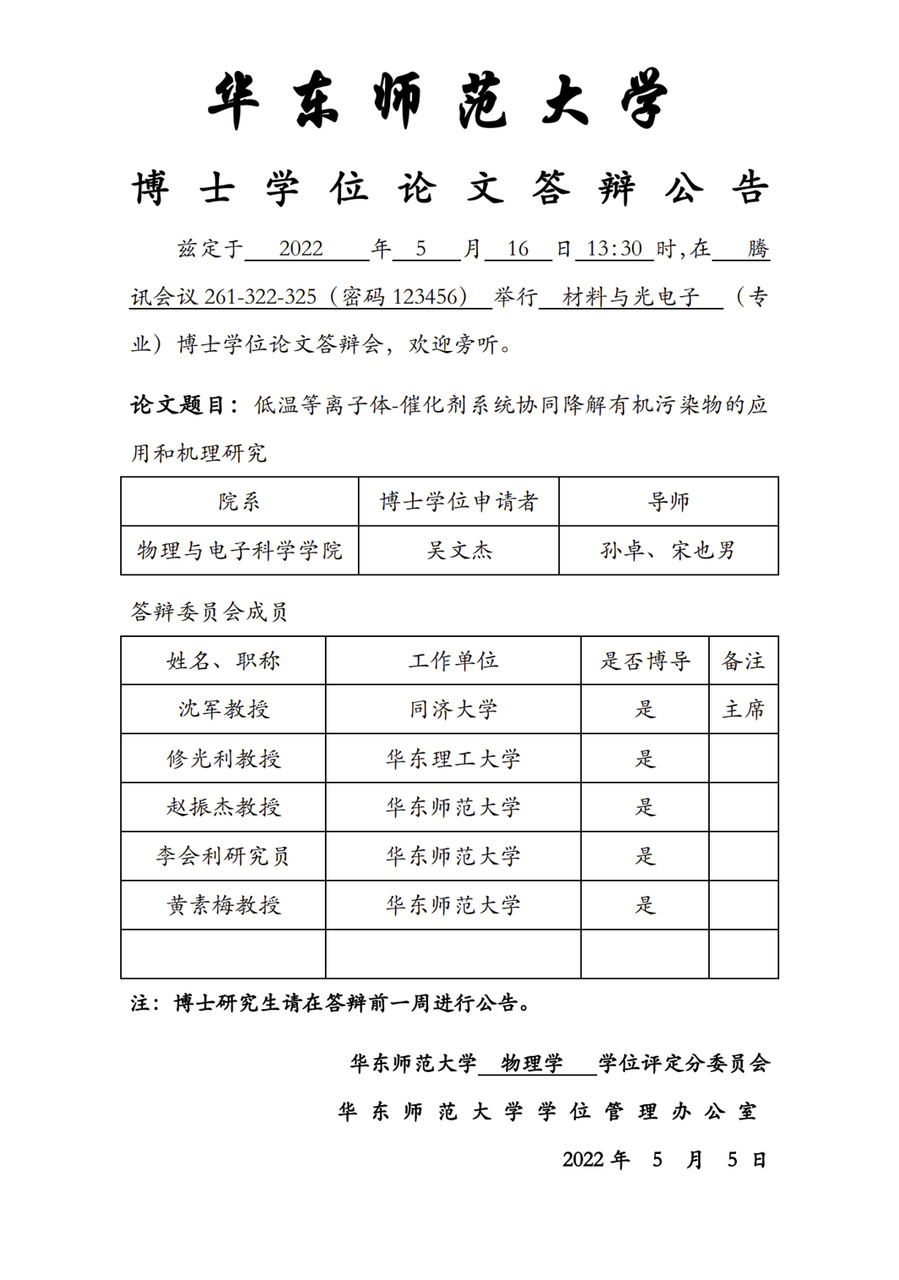 华东师范大学 博士学位论文答辩公告-吴文杰