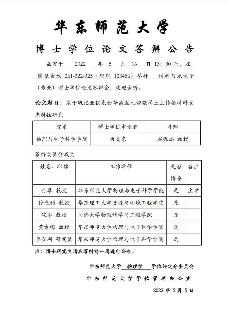 华东师范大学 博士学位论文答辩公告-余美东