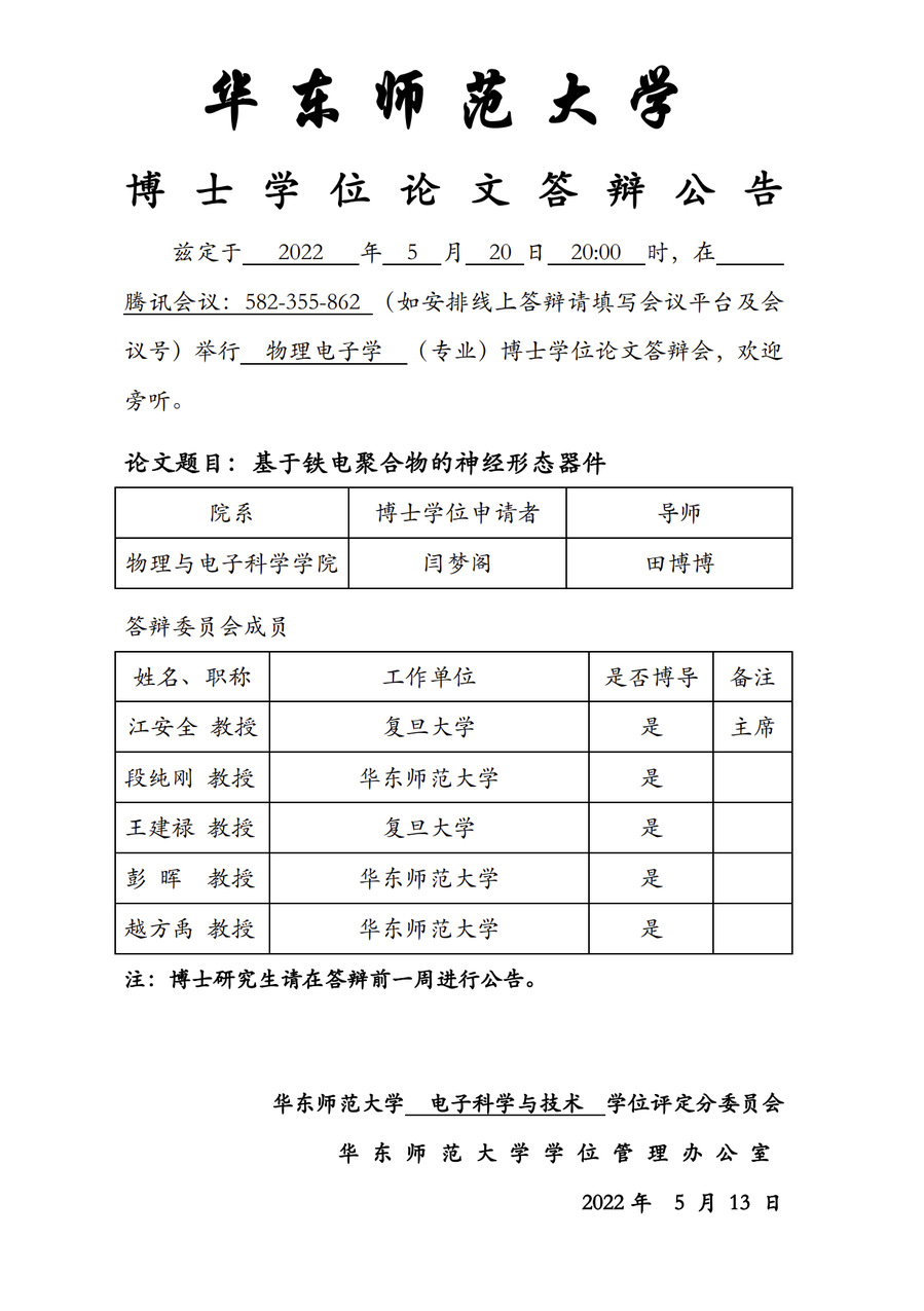 华东师范大学 博士学位论文答辩公告-闫梦阁