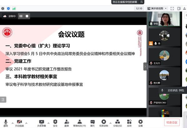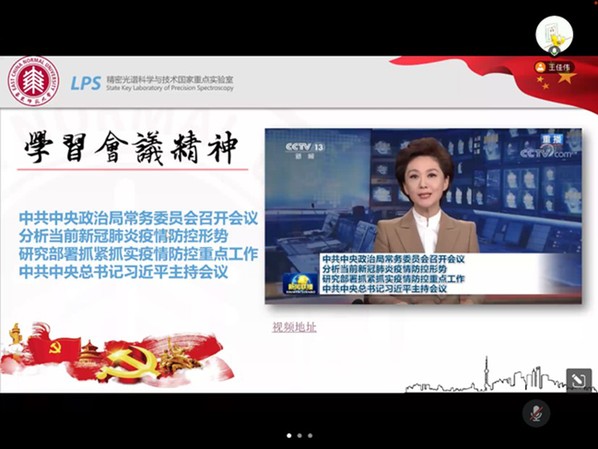 根据校党委组织部和学院党委相关要求,自5月8日起,各基层党支部纷纷开展支部研学,物理学系教工党支部、物理实验中心教工党支部、精密光谱国重实验室教工第一党支部、精密光谱国重实验室教工第二党支部、2020级研究生第二党支部、2020级研究生第一党支部、精密光谱国重实验室2021级研究生第一党支部、精密光谱国重实验室2020级研究生党支部等师生党支部分别开展多种形式的线上学习交流。物理学系教工党支部就学校疫情防控情况以及在线教学情况进行了交流讨论;精密光谱国重实验室教工第一党支部邀请留守校园抗疫和居家抗疫的党员同志结合会议精神,分享抗疫故事和感悟。