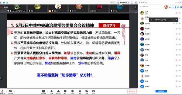 学院党委书记李恺介绍了学校、学院最新疫情防控形势,同时领学会议精神,李恺谈到,中共中央政治局常委会在3月17日和5月5日先后两次召开会议,研究部署全国疫情防控工作,明确了具体工作要求,提振了抗疫必胜的信心,越是疫情防控关键时刻、吃劲阶段,越要统一思想、坚定信心。全院师生要深入学习领会会议精神, 毫不动摇坚持“动态清零”总方针,坚决抓好落实,凝聚起抗击疫情、攻坚克难的强大合力;党员师生要严守防御底线、压实工作责任,当好防疫政策的宣讲员、当好防控工作的示范者、当好师生群众的贴心人,打好校园保卫战,打赢大上海保卫战。