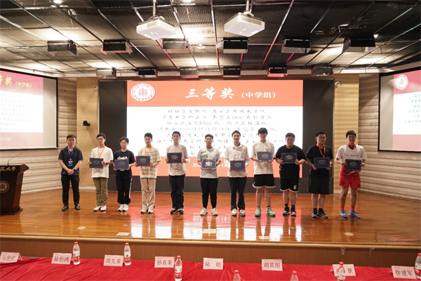7月14日下午,大赛闭幕式在闵行校区大学生活动中心举行。上海科学院院长、上海教委原副主任孙真荣教授,上海市物理学会副理事长,复旦大学原副校长陆昉教授;教育部大学物理课程教学指导委员会副主任、上海市物理学会大学生物理竞赛委员会主任上海交通大学胡其图教授;华东师范大学教务处处长周先荣教授;上海市物理学会原秘书长、上海交通大学高景教授;上海市物理学会常务副秘书长,复旦大学徐建军教授;上海市教育学会物理教学专业委员会主任陆伯鸿教授;中国物理学会教育委员会副主任、上海市物理学会大学物理竞赛委员会副主任、复旦大学马世红教授;上海市教师教育学院特级教师、正高级教师、物理教研员汤清修老师等出席闭幕式并为获奖代表队颁奖。