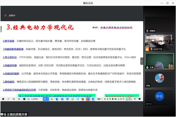 王青教授讲述了清华大学物理系主干课程《电动力学》的课程建设情况及成效,他自1989年清华博士毕业留校后,即被安排讲授64学时的《电动力学》,至今32年,王青教授讲述了自己从助教到主讲教师,从使用板书到使用ppt的教学成长经历。随后,他围绕课程系统阐述了经典电动力学的现代化,内容重构和问题引导的教学改革,慕课与线上教学实施,翻转课堂与问题驱动式的互动教学,信息技术支持介入与混合式教学,课程思政等方面内容,展示出《电动力学》从知识走向能力,再向价值进军的课程建设全过程与成效。