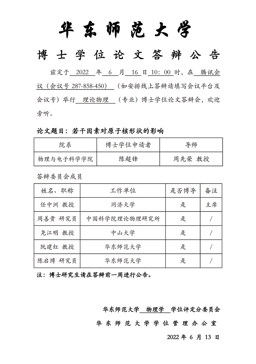 华东师范大学 博士学位论文答辩公告-陈超锋