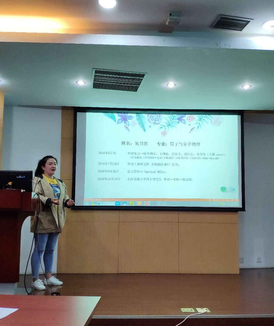 接下来就是正式经验交流会。第一位分享经验的是生物物理的鲁露,她签约了上海静安区的中学,耐心的讲述了上海教师招聘的一系列环节,无论是前期的充分准备,比如简历制作、教材熟悉、等,还是后续的教师招聘流程,像报名时间的关注、教师考试等,这些信息都为以后想留在上海工作的同学提供了宝贵的经验。