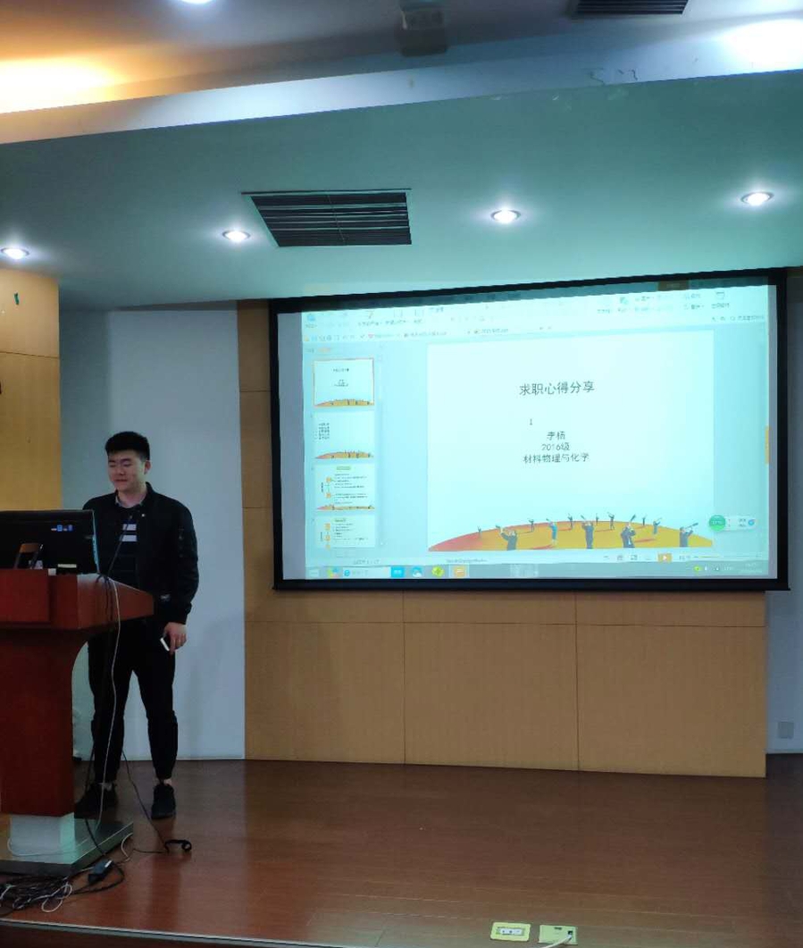 正式经验交流会开始前,聂树伟老师为大家介绍了2019届各专业同学的就业情况,使同学们对就业形势有了大体的了解,并对就业协议书的使用、上海落户政策、毕业论文的按时完成等注意事项进行了讲解。