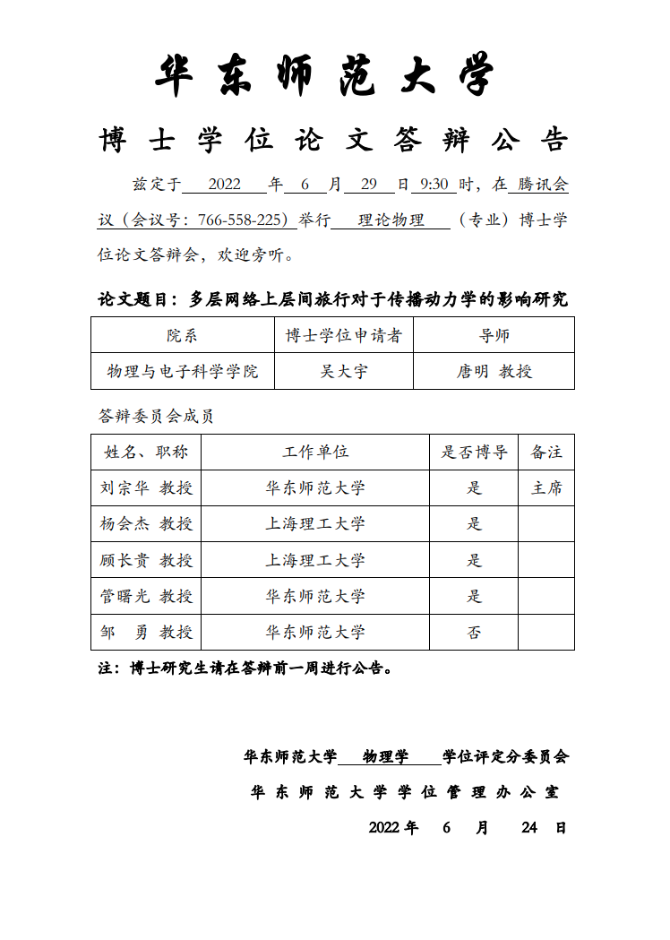 华东师范大学 博士学位论文答辩公告-吴大宇