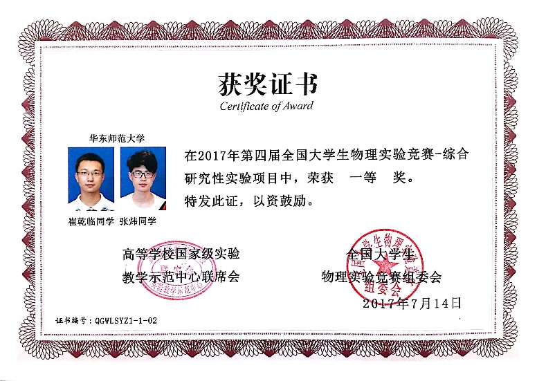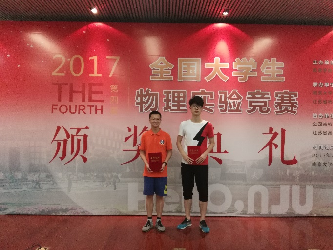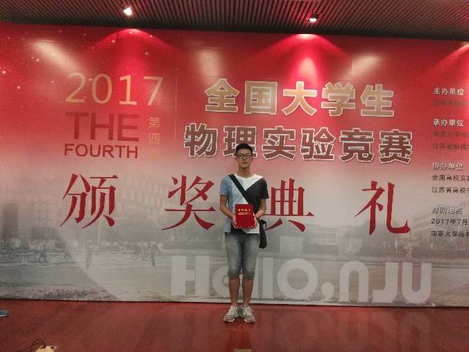 2017年7月12日,由高等学校国家级实验教学示范中心联席会主办,全国高校实验物理教学研究会和江苏省高校实验室研究会协办,南京大学乐鱼在线(中国)和江苏省物理学会承办的第四届全国大学生物理实验竞赛在南京大学仙林校区举行。经过两天的激烈角逐,我院14级本科生崔乾临与张炜同学获综合研究性实验项目一等奖,15级本科生石佳辰同学获基础性实验项目二等奖,15级本科生戴羽同学获基础性实验项目的入围奖。