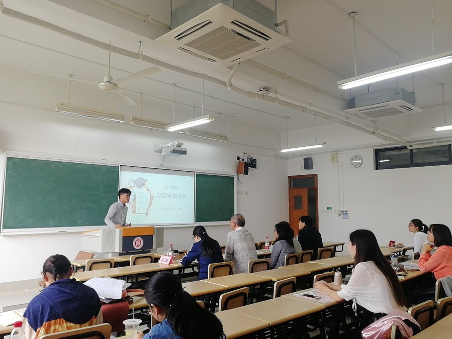 最后,关工委朱鋐雄老师进行了点评,对选手的表现予以肯定,对大家提出更高的要求。一是教学要体现教育思想,进行教学设计时要考虑到讲、教、学结合,心里要有学生;二是要注重教学语言和教态;三是注意教学媒体的使用,包括板书、PPT、实验演示的合理使用。教育部2017年制定了最新的高中物理课程标准,对中学物理教学提出了新的要求,希望同学们积极学习,紧随教育教学改革发展,体现在教学中。
