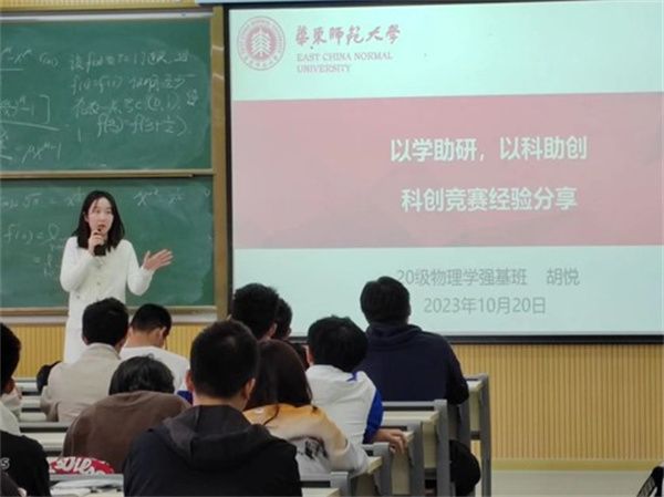 10月20日,2020级物理学强基班本科生胡悦在四教202教室分享科创经验,她介绍了本科生获取科创信息的渠道、参加科创的流程以及如何在科创中取得优异成果。通过比较科创竞赛与课内学习的异同,胡悦给出“基于课内,联系实际”的竞赛攻略,建议同学们勤于思考,精于实践,让课程学习与科创参与相辅相成、齐头并进。最后,胡悦展示了自己的科研竞赛时间轴,鼓励同学们要珍惜时间,勇敢尝试,把握好大学时光的每一分钟。她谈到,“能够有成果的不一定是非常聪明的人,但一定是能坚持下来的人。”