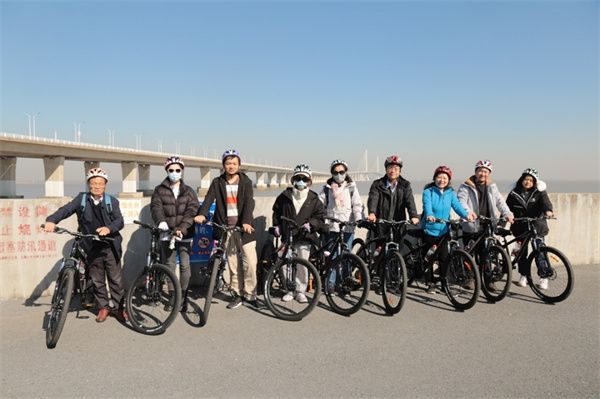 19日,教职工带齐装备,骑行于绵延的林荫道中,直到美丽的入海口。沿江边海堤骑行,海风吹拂着脸颊,欣赏蓝天、风车、白云、大海、芦苇、轮船,偶有飞机从头顶略过,水云间的辽阔美景沁人心脾。随后,教职工们来到橘园采摘,当下正是长兴岛蜜桔成熟的季节,在道路两侧,随处可见硕果累累的桔子树。大家兴高采烈地投入到了采摘行列,不一会儿就满载而归。