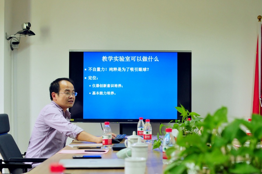 我院副教授沈国土以《<近代物理实验>课程及相关情况——兼说几个教学瞬间》为题,就我校近代物理实验现有实验仪器、实验课程实施、教学情况及部分学生反馈做了简要介绍,同时介绍了我校在近代物理实验课程中融入思政教育的设想与案例。他诚挚邀请专家为近代物理实验的修购基金计划提出宝贵意见和建议,对增加仪器给予指导。