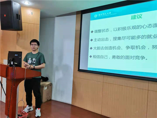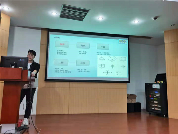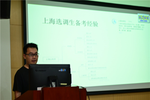 光学专业硕士研究生孙伟介绍了自己对上海选调生笔试的复习以及面试细节,分析了什么样的人适合选调生岗位,考上选调生之后都做些怎样的工作等问题。同时,他结合自身的感受和经验,针对同学的关注点,给大家带来不少解决问题的思路与方法。他精彩的讲解,赢得了同学们阵阵热烈的掌声。