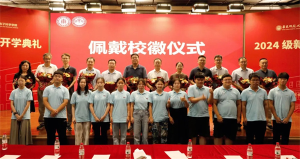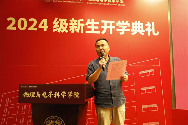 新程璀璨,向光而行。9月12日上午,物理与电子科学学院2024级新生开学典礼在大学生活动中心C区报告厅,本硕博新生参加典礼。学院党委书记李恺,学院院长、精密光谱科学与技术国家重点实验室主任程亚,副院长武海斌、胡炳文、徐敏,教师代表、国家杰出青年科学基金获得者金庆原,极化材料与器件教育部重点实验室常务副主任、院长助理越方禹,纳光电集成与先进装备教育部工程研究中心主任方俊锋,上海市磁共振重点实验室主任姚叶锋,理论物理研究所所长刘宗华,光与原子量子所所长张可烨,电子科学系系主任唐晓东,材料科学系系主任保秦烨,2024级本科新生青蓝工程专业班主任成岩、张媛媛、蒋冬梅、周杰及2024级新生辅导员、学院行政老师出席。典礼由学院党委副书记栗蕊蕊主持。
