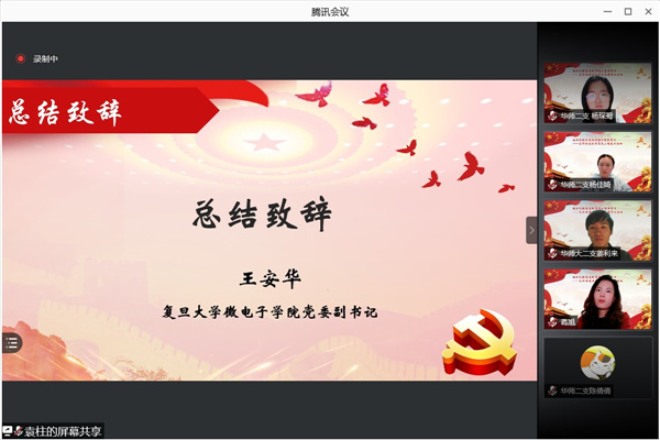 最后,复旦大学微电子学院党委副书记王安华作总结发言。他表示,中国共产党经历了百年的奋斗发展,取得了举世瞩目的成就。新时代的青年党员要勇担时代使命,面对新形势、新挑战,要树立远大理想,练就扎实本领,迎难而上,锐意进取,自觉把个人理想同党和人民的事业联系起来、同“第二个百年”奋斗目标联系起来,让奋斗成为青春最亮丽的底色。
