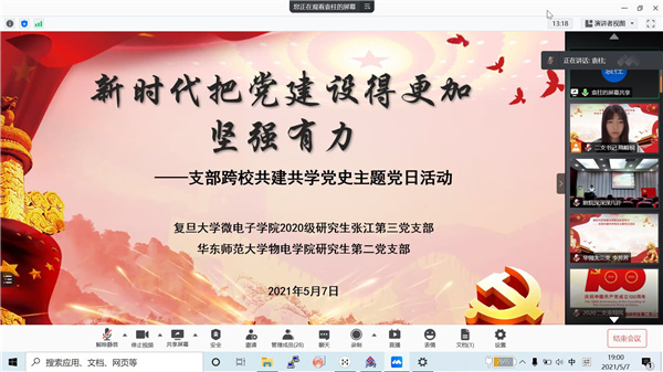 随后,复旦大学微电子2020级研究生张江第三党支部书记顾俊杰和我院2020级研究生第二党支部宣传委员陈倩倩分别介绍了各自党支部情况、党建活动特色以及支部工作开展情况。两个结对支部就支部管理工作进行了分享交流。