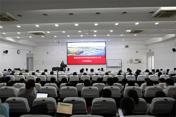 9月25日下午,物理与电子科学学院在闵行校区一教106报告厅召开全体教职工大会,210余名教职工参会。学校人事处副处长孙振华应邀解读《华东师范大学专任教师聘期考核办法》文件精神,学院党政班子成员领学党的二十届三中全会精神和全国教育大会精神,传达全校教师干部大会精神,并通报近期重点工作,会议由学院党委书记李恺主持。