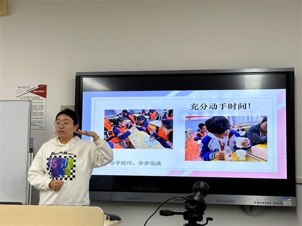 第一讲课程结束后,“追光”科普宣讲团成员、2020级本科生韩婷结合自己3次授课经验,分享了课程准备、课堂应对的经验和教学反思。她谈到,在远程教学中,和网络另一端学生的互动非常重要,可采用“做出实验请大家给我挥挥手”等办法活跃课堂气氛,实现良好互动。