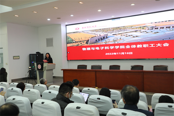 11月16日下午,物理与电子科学学院在闵行校区四教106报告厅召开11月全院教职工大会。我校终身教授、上海市学习贯彻党的二十大精神专家宣讲团成员齐卫平教授应邀作题主题报告。学院党政班子成员通报重点工作,孟宪承书院副院长梁宏亮介绍物理专业师范生培养情况。会议由学院党委书记李恺主持,三百余名师生线上、线下参会。