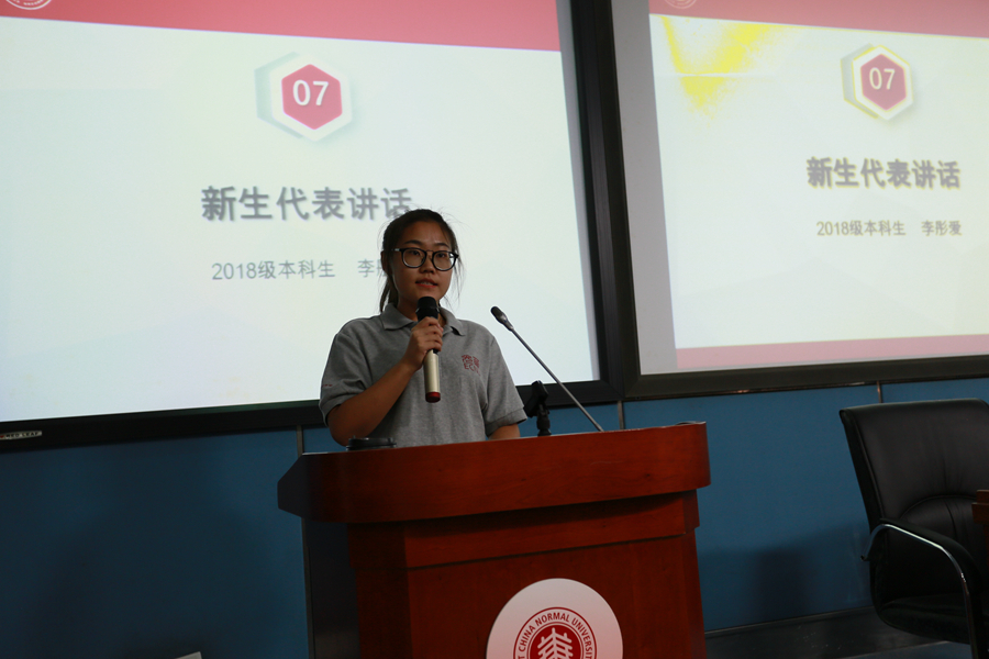 最后2018级本科生李彤爱代表新生表示华东师大是梦开始的地方,将自强不息、严于律己,开创属于自己的精彩人生。