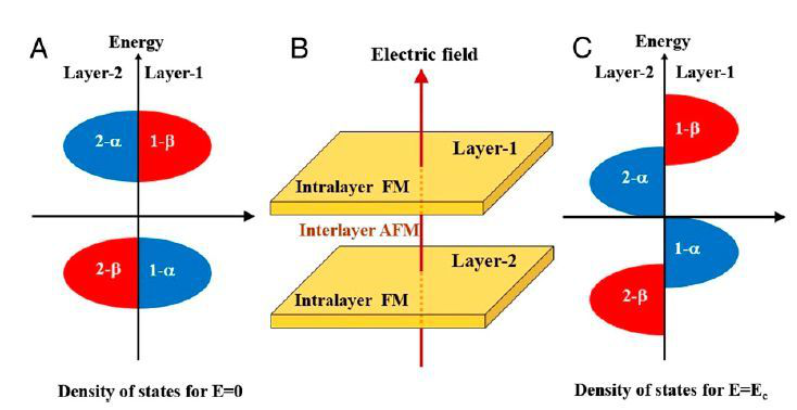 图4(A)为无外加电场时半导体性的A-type反铁磁能带示意图,由于A-type反铁磁的结构特点,使得layer-1与layer-2中自旋属性相反;图4(B)为双层A-type反铁磁的结构示意图,施加从layer-2指向layer-1的电场将导致双层结构的layer-1电势升高,layer-2电势降低。外加电场达到一定强度时(临界电场),导带底与价带顶接触,发生半导体-金属相变,同时费米能级附近被同一种自旋态(蓝色)占据,形成100%自旋极化的half-metallicity性质(图4(C))。