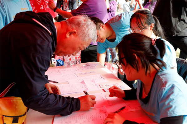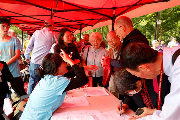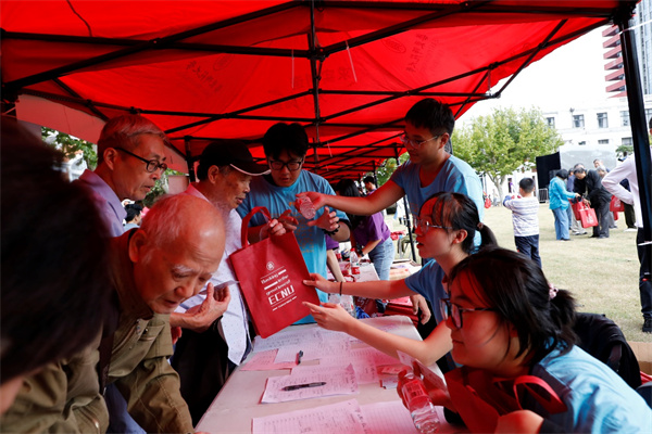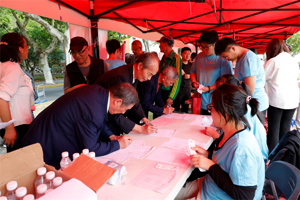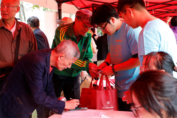 上午8点钟,学院的接待摊位前已人头攒动,校友陆续前来签到,志愿者给他们分发了校友大礼包。