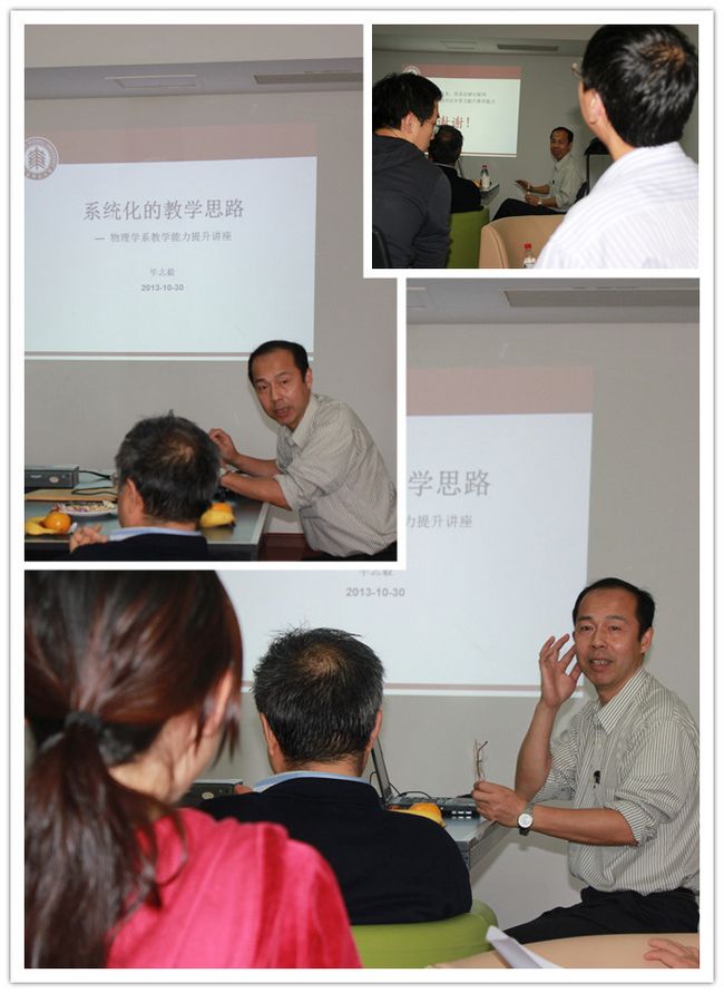 为提升物理学系老师的教学能力,在华东师范大学教务处教师教育发展中心的支持下物理学系于2013年10月30日下午于闵行校区物理楼227室举办了教师教学能力提升讲座及交流活动。讲座及交流活动由物理学教学主任王向晖老师主持,物理学系主任黄国翔老师致开场词,物理学系书记马学鸣老师、物理学系科研主任徐敏老师、物理学系教学督导朱鋐雄老师及华东师范大学广大老师参加讲座活动。