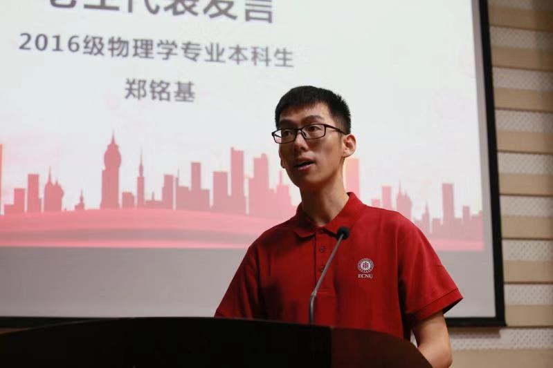 2016级物理学专业本科生郑铭基作为老生代表发言,表示要在夯实专业基础的同时,不断拓宽知识面、恪守学术道德、勇于在传承中创新,在一个充满张力的知识世界中塑造自己,珍惜光阴、格物致知。