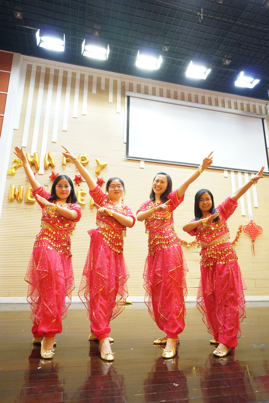 光学重点实验室的四位老师带来金光闪闪的舞蹈《招财舞》,主持人也借此向大家恭喜发财。