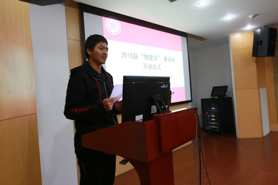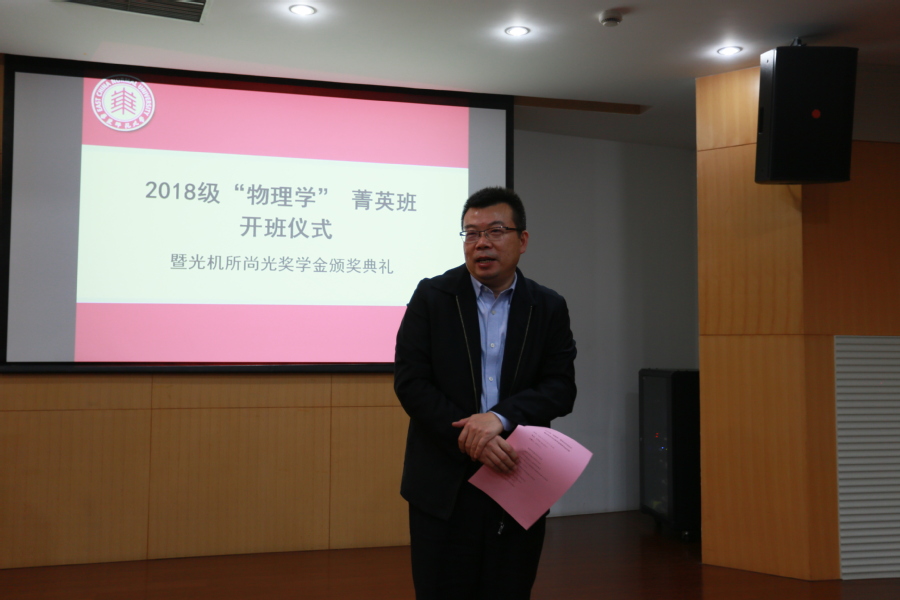 周先荣副院长着重介绍了物理学菁英班的情况,强调从科研配备、硬件保障、导师配备等全方位对菁英班同学进行培育,努力提升学生的国际化视野,尽可能提供优质平台帮助同学们实现“物理梦”。光机所副主任刘鹏介绍了光机所的园区、人才队伍及十三五规划布局等内容。精密光谱与国家重点实验室主任吴健希望同学们珍惜好的学习环境,高标准严要求自己,勇于面对学习生活中的各种困难。校教务处副处长谭红岩在讲话中指出,师大“育人、文明、发展”的三大使命相关的政策正在逐步落实,感谢光机所设立“尚光奖学金”对学生进激励。期待同学们不忘初心,珍惜时光;立长志立大志,不畏艰难险阻;把个人发展与社会发展相结合,从而实现个人的长足发展。
